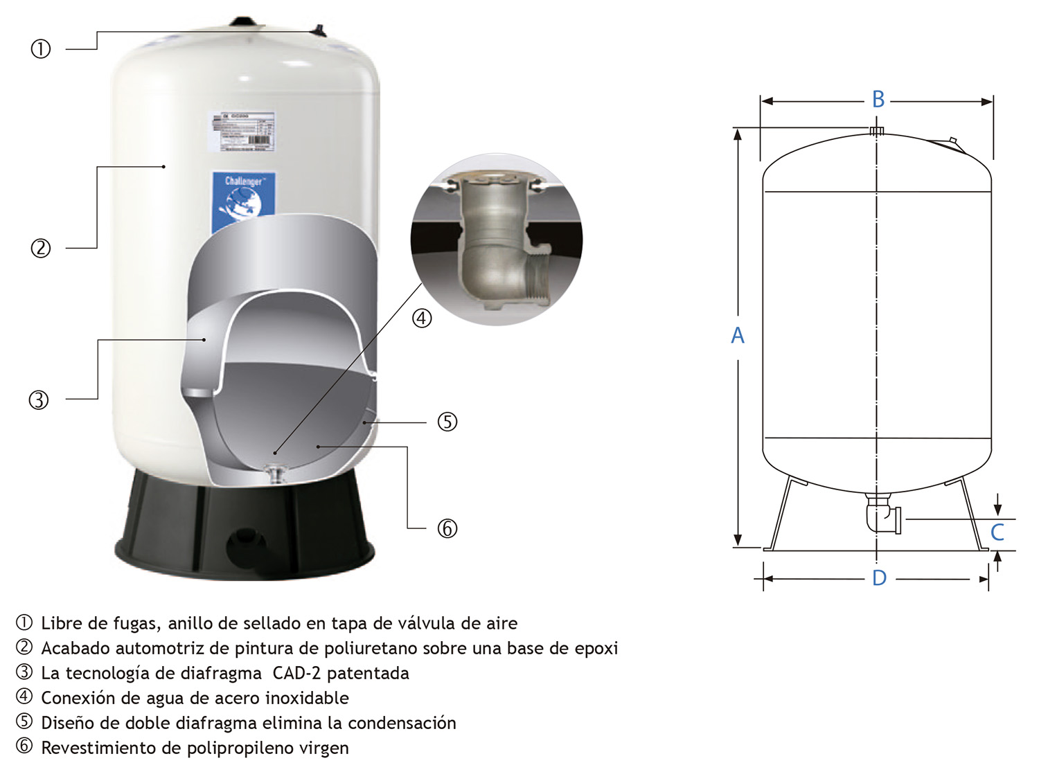 - Los eficaces y económicos depósitos Challenger ™ están diseñados con la nueva tecnología de de diafragma CAD-2 patentada (Controlled Action Diaphragm, diafragma de acción controlada). Incorpora una membrana de butilo 100% resistente al cloro con un revestimiento de polipropileno copolímero moldeado con precisión para excelente separación del aire y el agua. El ensamblaje de la membrana CAD-2 se realiza mediante un anillo bloqueador de retención interior, de tal forma que el agua de descenso queda dentro de una atmosfera pre cargada con aire, proporcionando una separación entre la membrana y la pared del depósito, sellando el agua en una cámara totalmente anticorrosiva. Este diseño de «colchón de aire”, significa menos problemas con la condensación.